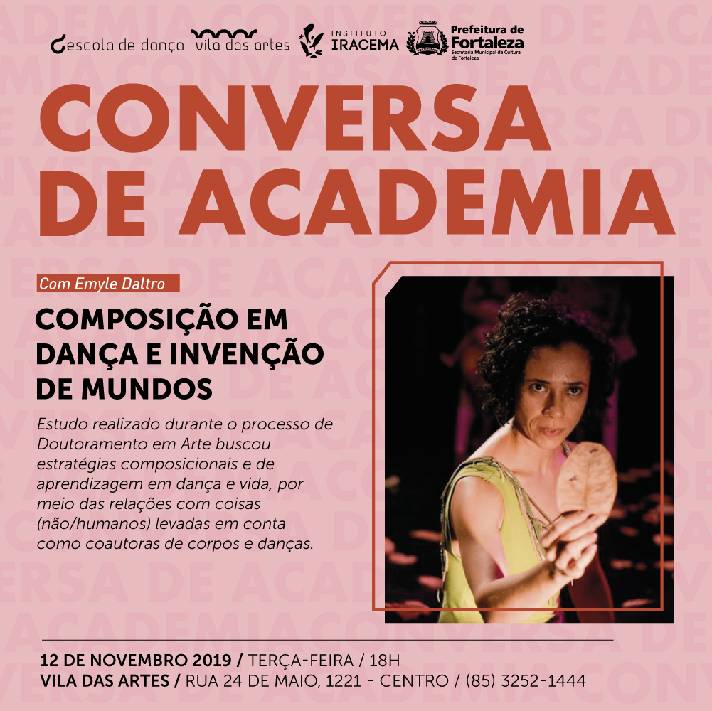 A Vila das Artes realiza, por meio da Escola Pública de Dança, na terça-feira (12/11), mais uma edição do programa Conversa de Academia. A convidada é a dançarina e pesquisadora Emyle Daltro, que apresentará o tema “Composição em dança e invenção de mundos”, estudo realizado durante seu processo de Doutoramento em Arte. O evento tem início às 18h, na Vila das Artes.