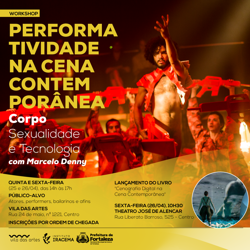 A Vila das Artes promove, na quinta e na sexta-feira (25 e 26/04), o workshop "Performatividade na Cena Contemporânea – Corpo: Sexualidade e Tecnologia", com o professor da Universidade de São Paulo (USP) Marcelo Denny. A atividade ocorre das 14h às 17h e terá inscrições por ordem de chegada. A atividade é uma realização da Escola Pública de Teatro da Vila das Artes, equipamento cultural da Prefeitura de Fortaleza, gerido pela Secretaria Municipal da Cultura de Fortaleza (Secultfor) em parceria com o Instituto Cultural Iracema (ICI).