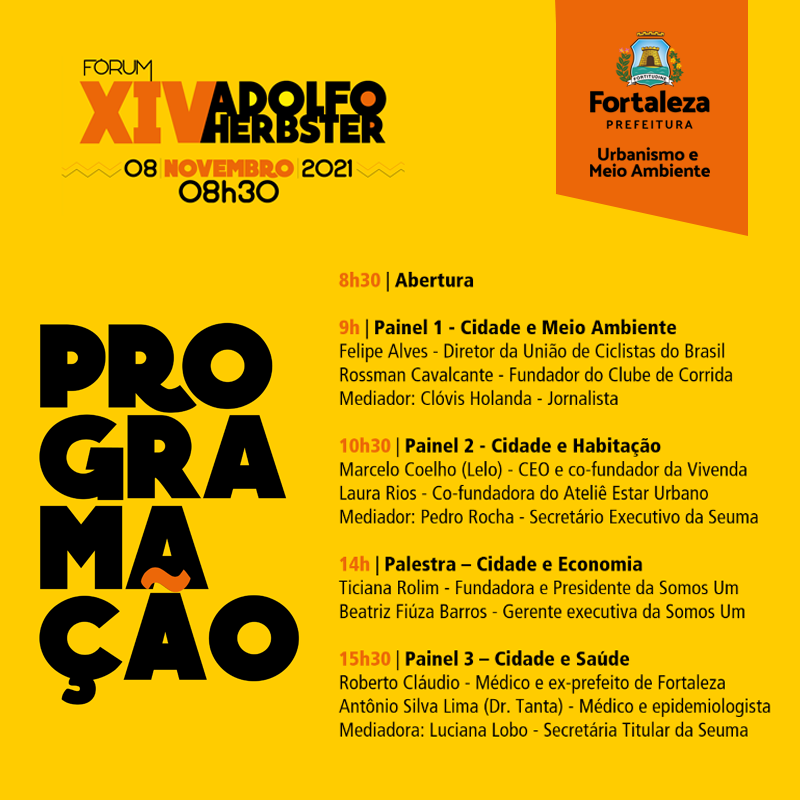 A Prefeitura de Fortaleza, por meio da Secretaria Municipal do Urbanismo e Meio Ambiente, realiza, na próxima segunda-feira (08/11), a XVI edição do Fórum Adolfo Herbster. O evento, que foi instituído em 1979, debate com a sociedade os instrumentos de desenvolvimento urbano para Fortaleza. O encontro inicia a partir das 8h30, de forma presencial, no Teatro São José. As inscrições estão disponíveis neste link. As vagas são limitadas e haverá emissão de certificado.